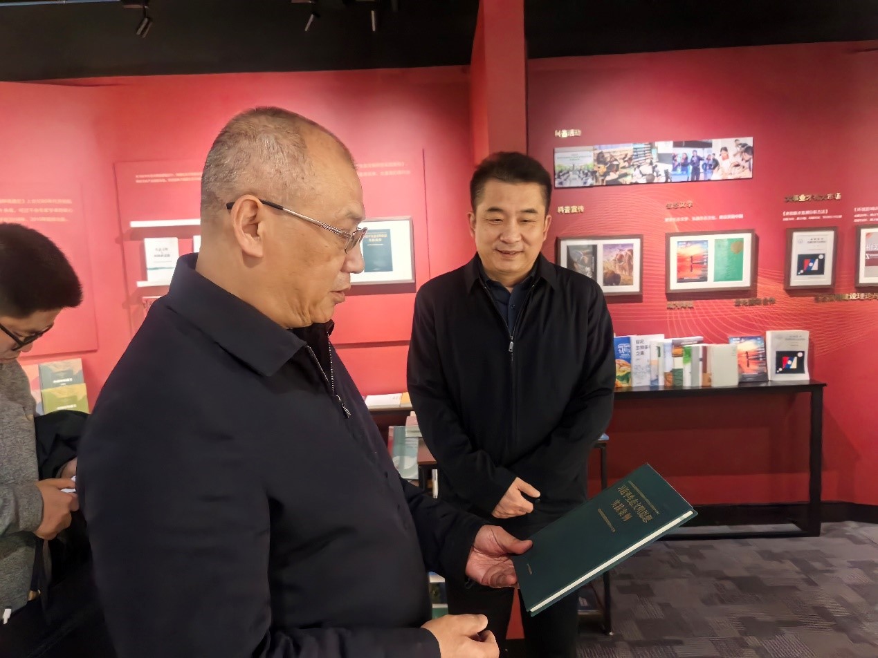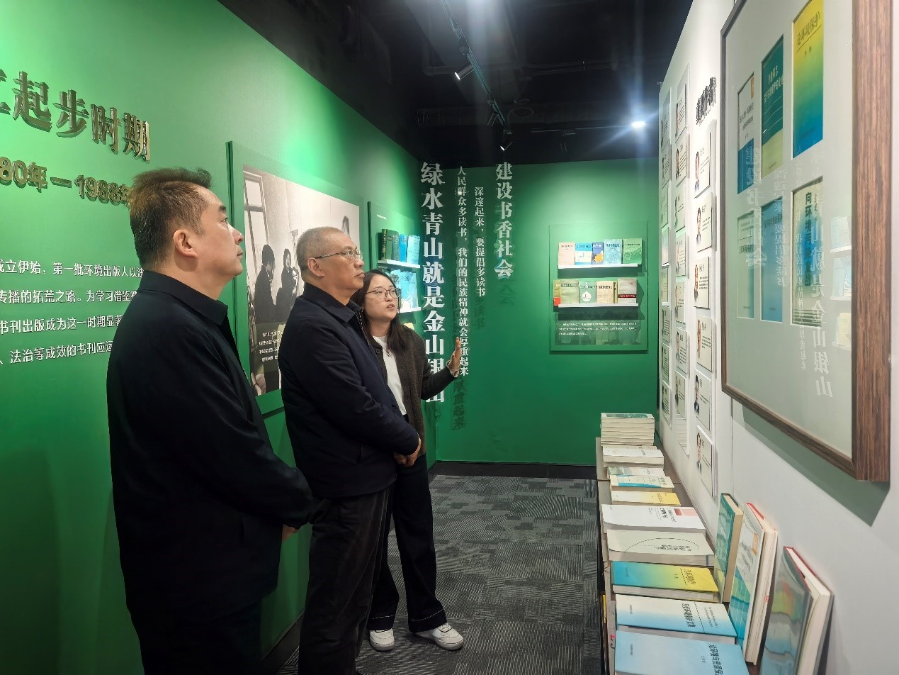 調(diào)研中,潘碧靈一行參觀了集團(tuán)版本室,詳細(xì)了解集團(tuán)發(fā)展歷程、精品圖書出版及融合出版實(shí)踐,對(duì)出版集團(tuán)作為生態(tài)環(huán)境部直屬專業(yè)出版機(jī)構(gòu),在宣傳國(guó)家環(huán)保方針政策、傳播環(huán)境科學(xué)知識(shí)、提升全民生態(tài)意識(shí)中發(fā)揮的重要作用給予肯定。